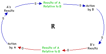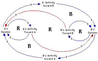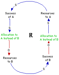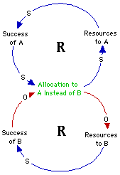 The above redrawn version of the Success to the Successful structure makes its reinforcing nature much more obvious. It is the Success to the Successful structure which is at the heart of so many self-fulfilling prophesies, which are actually the result of unperceived influences on our own part.