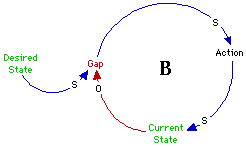 The Desired State interacts with the Current State to produce a Gap. The larger the Gap the stronger the influence to produce Action. The Action taken then moves the Current State toward the Desired State reducing the Gap. When the Action succeeds in moving the Current State to the Desired State the Gap is reduced to zero and there is no more influence toward Action.