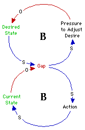 The Desired State interacts with the Current State to produce a Gap. This Gap influences Action intended to move the Current State in the direction of the Desired State. At the same time the Gap influences Action it creates a Pressure to Adjust Desire. This pressure essentially acts as an influence to reduce the Desired State. As the Desired State is undermined it works to reduce the Gap lessening the influence toward Action. The final result of this structure is that it reaches an equilibrium other than what was the initial Desired State.