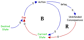 The internal balancing loop operates in the standard balancing loop fashion. The Action that influences the migration of the Current State also influences, after some delay, some Unintended Consequences. These Unintended Consequences subsequently impede the migration of the Current State in the intended direction.