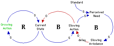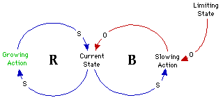 Growing Action interacts with a Current State in such a way that the Current State promotes more of the same Growing Action. As the Current State increases it interacts with some Limiting State to produce a Slowing Action. This Slowing Action then influences the Current State in such a way as to limit the growth promoted by the Growing Action.