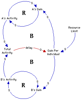Initially using the resource contributes to each reinforcing loops results. After some time the total activity of the reinforcing structures exceed the capacity of the resource which results in a reduction of the growing action for each of the reinforcing structures. As the Total Activity approaches the Resource Limit it begins to limit the Gain Per Individual essentially limiting the gain of both reinforcing structures.