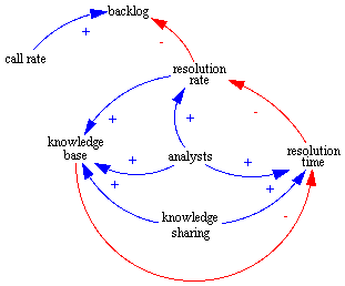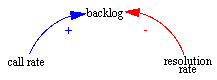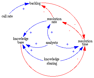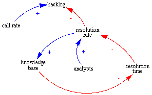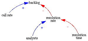 This influence is between backlog and resolution time. The members of an organization have a perception of what is considered an acceptable backlog. As the backlog rises above this level analysts essentially decrease the average resolution time to bring the backlog back in line with what they consider acceptable. This may or may not happen without management attention to the rising backlog. This decrease in resolution time has a limit. As the resolution time decreases analysts begin to experience additional stress and begin to experience burnout. When this happens the average resolution time will begin to decrease. At this point employees will also probably begin to bail out of the organization. This bailout influence is currently not being taken into account.