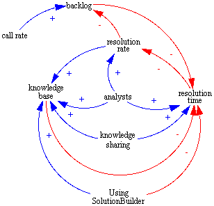 Using SolutionBuilder increase the rate of development of the knowledge base. This rate of increase depends on the number of analysts actively engaged in Using SolutionBuilder. Using SolutionBuilder also influences and increase in average resolution time because it takes additional time for an analyst to develop the solution in SolutionBuilder. Note that this increase is substantially less than the increase associated with knowledge sharing as it is not multiplied by the number of analysts for they are not involved with the developed solution until such time as they need to use it. When this usage occurs it shows up as a known problem delivery using SolutionBuilder. A resolution time which is much less than the resolution time associated with the initial development of the solution.