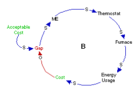In heating my home I have an idea of what is an acceptable cost. The interaction of the actual cost with the acceptable cost produces a gap which influences me to turn down the thermostat. This in turn causes the furnace to run less reducing the energy usage and the resultant cost. This part of the system is not easily controlled because I don't see the cost until at least a month after the energy was used. Acceptable cost is part of another subsystem (income) not considered here.