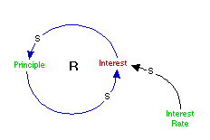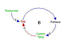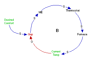 My desired comfort interacts with the current temperature producing a gap. This gap influences me to increase the thermostat, influencing the furnace which influences the current temperature, thus reducing the gap. Desired comfort is an element of some other subsystem not considered here.