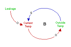 The outside temperature interacting with the leakage factor influences the current temperature which influences the outside temperature. The leakage factor determines the rate at which this influence takes effect. Also, the degree to which the inside temperature affects the outside temperature is considered to be minimal. Leakage is part of another subsystem not considered here.