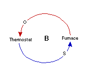 This example was selected because of its common occurrence and characteristics which may serve as parallels to organizations. In its simplest form the thermostat influences the furnace, which influences the thermostat. The system adjusts to the temperature indicated by the thermostat.